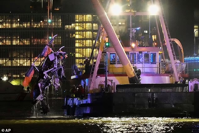 A crane vessel lifts the wreckage of a helicopter that crashed into the Hudson River