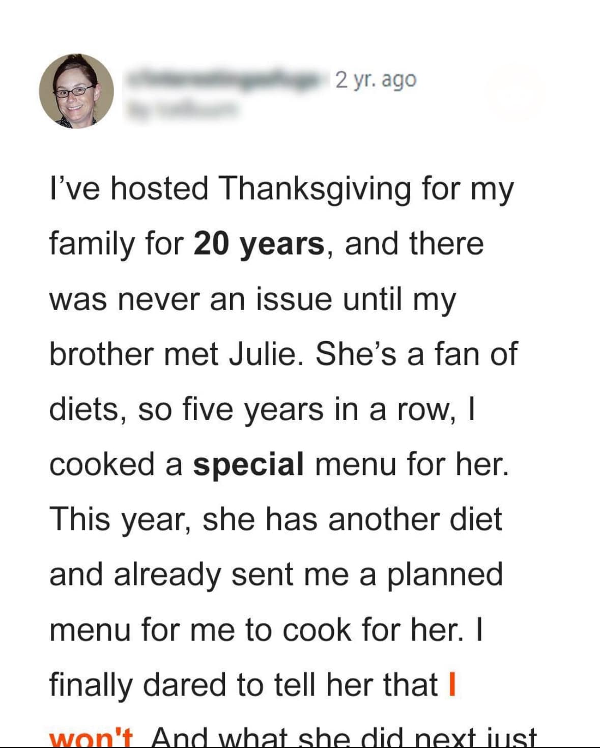 A woman took it to Reddit after canceling the family Thanksgiving dinner she had hosted for the past twenty years. She made the difficult decision because of her...